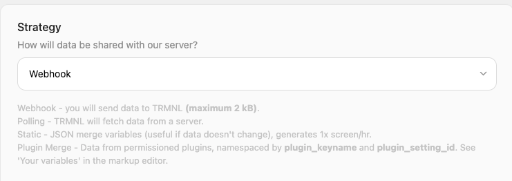 Data can be passed to a plugin via strategies like Webhooks or Polling. For Webhooks, TRMNL provides a custom URL that accepts HTTP POST data, which is then rendered via HTML + Liquid templates.
